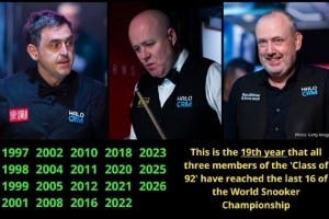 本次世锦赛,希金斯、奥沙利文、马克·威廉姆斯全部晋级16强,据totalsnookered的统计,本次世锦赛是“75三杰”第19次同时晋级世锦赛16强。