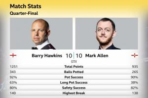 第三阶段开场,马克·艾伦连下两城将比分扩大到10-8,随后巴里·霍金斯打出单杆70分、83分连追两局。