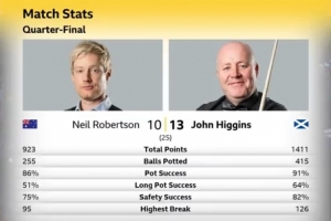 体育资讯4月30日讯 斯诺克世锦赛1/4决赛,希金斯13-10尼尔·罗伯逊,晋级四强。本场比赛两人数据如下(希金斯在先)