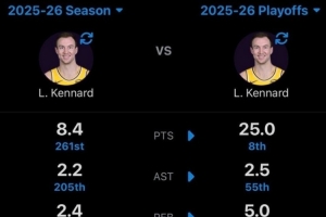 在过去两战,肯纳德场均出战40.1分钟,砍下25分5篮板2.5助攻1.5抢断,投篮命中率65.4%,三分72.7%,罚球80%。